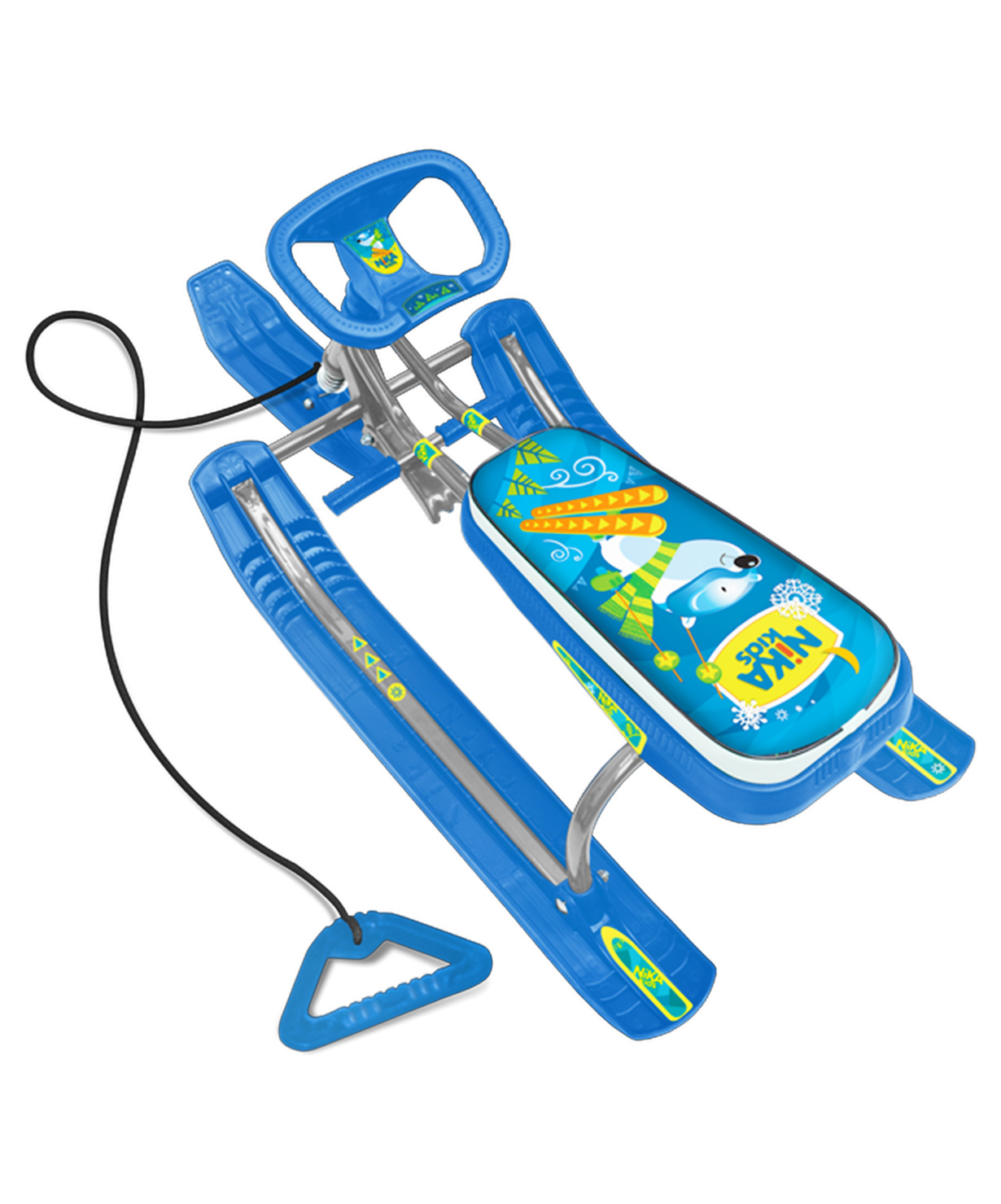 Сварная конструкция из стальных труб надежна, а с пластмассовые лыжи максимально снижают вес снегоката. Мягкое сиденье, обтянутое искусственной кожей, удобно и не позволит ребенку замерзнуть во время поездки. Яркий принт на сидении выделит ребенка из толпы. Усиленный тормоз надежен и достаточно эффективен даже на обледенелой поверхности.